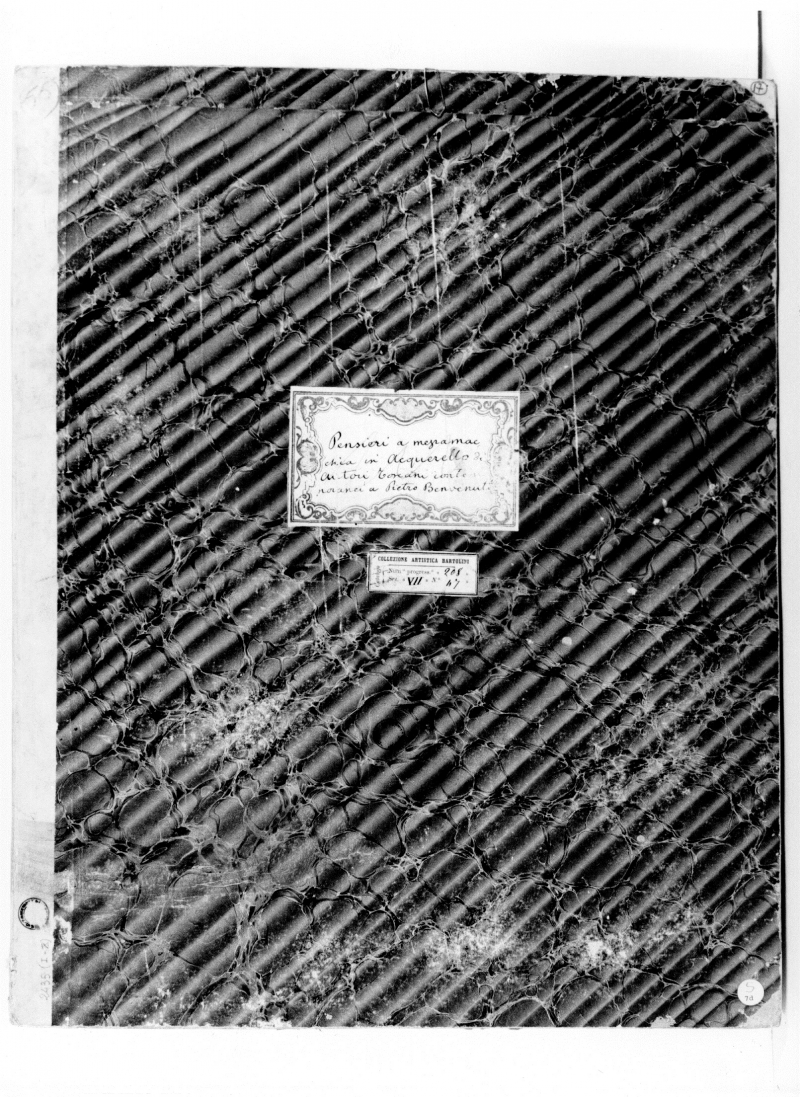 CARTELLINI: Nel piatto superiore al centro è stato incollato il cartellino stampato "COLLEZIONE ARTISTICA BARTOLINI/catalogo/Num. progress. 208 sez. VII N. 47”; Nel piatto superiore in basso a destra, è stato incollato un cartellino circolare stampato "7d" al di sopra manoscritta a lapis "S"; Nel piatto superiore al centro è stato incollato un cartellino stampato con cornice decorata azzurra, all’interno , manoscritta a penna e inchiostro: “Pensieri a mezza mac/chia in Acquerello di/Autori Toscani contem/poranei a Pietro Benvenuti”.