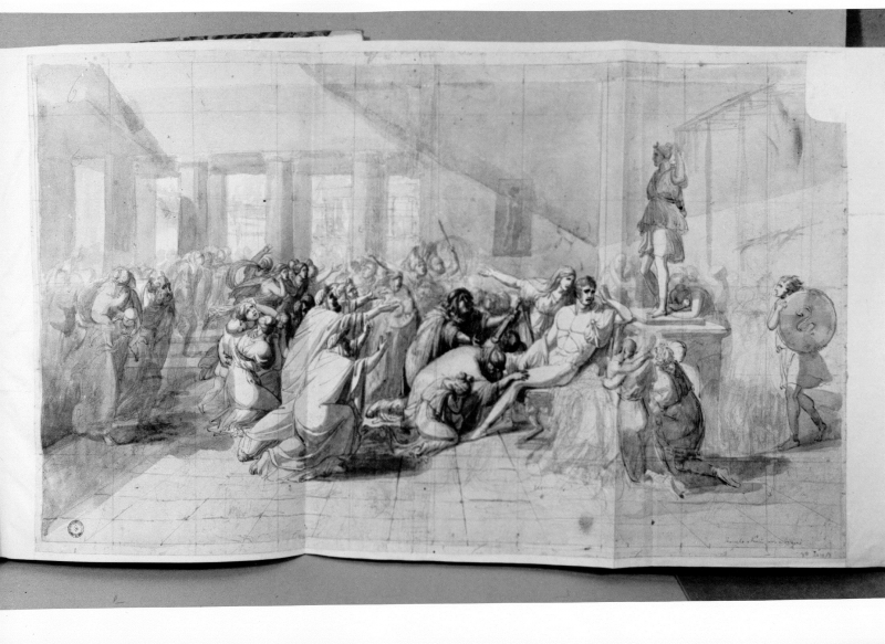 C.1: disegno ripiegato in due, a penna e inchiostro acquerellato marrone su carta bianca, nel recto: Priamo chiede clemenza ad Achille, e nel verso variante dello stesso soggetto, a penna e inchiostro acquerellato nero, dall’Iliade illustrata di F. Nenci (cfr. la c.1 catalogo mostra Francesco Nenci il pittore e l’illustratore (1782-1850), L. Fornasaria, Edifir, Firenze, 2012, p. 42 ; Ottocento ad arezzo. La collezione Bartolini, E. Agnolucci, Edifir, Firenze, 2003, p.188, n. 68).