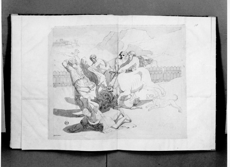 CC:15-16: disegno a penna e inchiostro acquerellato marrone, incollato su due pagine, con Scena con figure e toro, da Gagnerò.