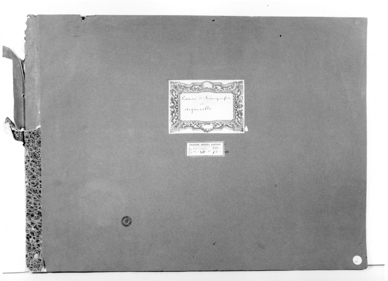 CARTELLINI: Nel piatto superiore al centro è stato incollato il cartellino stampato "COLLEZIONE ARTISTICA BARTOLINI/catalogo/Num. Progress. 213/Sez. VII N.52 "; Nel piatto superiore al centro, è stato incollato un cartellino profilato da una cornice con greca blu stampata, all’interno manoscritta a penna e inchiostro: “Pensieri di Scenografia/in/Acquerello”; Nel piatto superiore in basso a destra, è stato incollato un cartellino circolare stampato "8d”, al di sopra la seguente iscrizione, manoscritta a lapis: “S”.