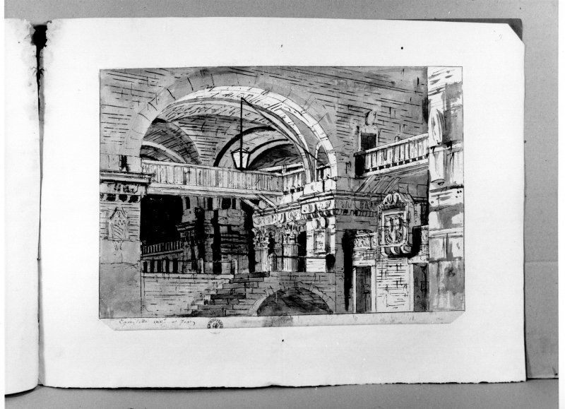 c.3: “Veduta scenografica d’interno”; (420x303) disegno a penna e inchiostro marrone e nero acquerellato, tracce di matita nera sottostante, profilato da sottile liea di cornice nera, in basso a sinistra, manoscritta a penna e inchiostro: “Camisettà inv. e fece”.
