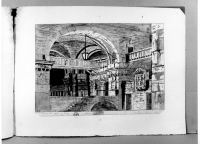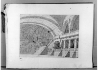 c.1: “Veduta scenografica d’interno”; (285x383) disegno a penna e inchiostro grigio acquerellato, tracce di matita nera sottostante, profilato da sottile liea di cornice nera