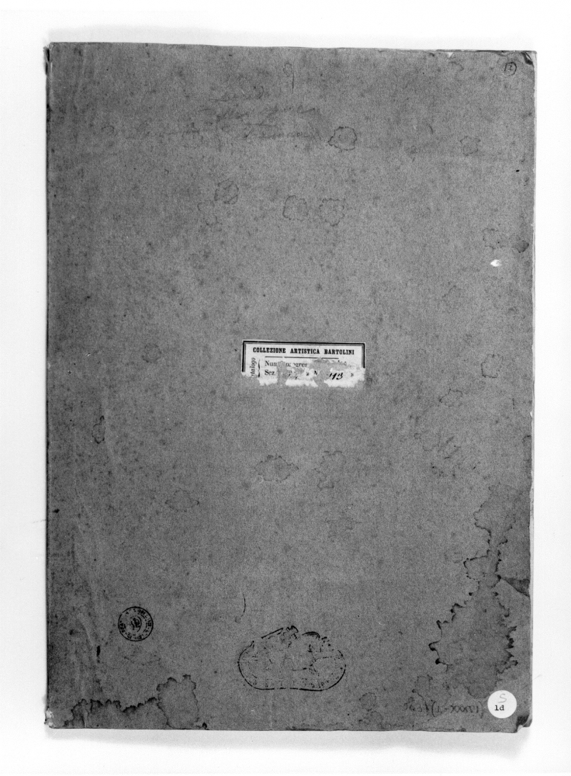 CARTELLINI:Nel piatto superiore al centro è stato incollato il cartellino stampato "COLLEZIONE ARTISTICA BARTOLINI/[…]talogo/Num. […]GRES[…]/Sez. [...]"; Nel piatto superiore in basso a destra, è stato incollato un cartellino circolare stampato "1d" al di sopra manoscritta a lapis "S".