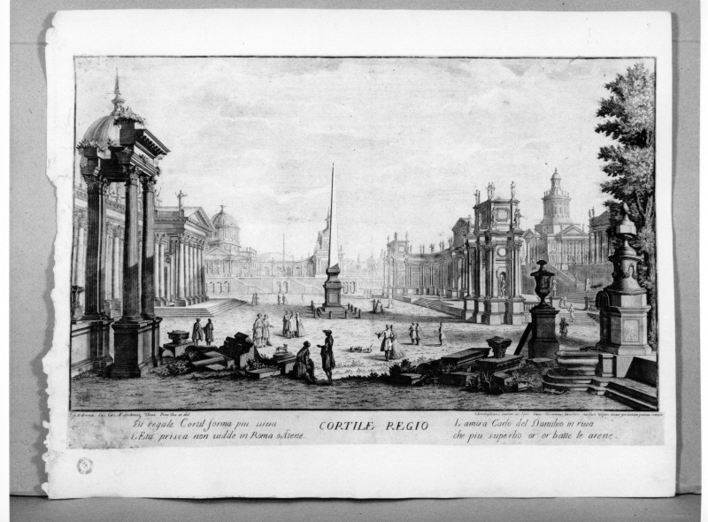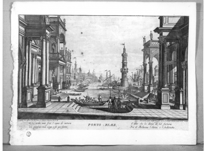 5 stampe incise all’acquaforte e bulino da C. Dall’Acqua da disegni di G. Galli detto il Bibien con vedute scenografiche; le stampe (425x640) sono tagliate entro i margini ed incollate interamente sulla pagina, raffigurano :
