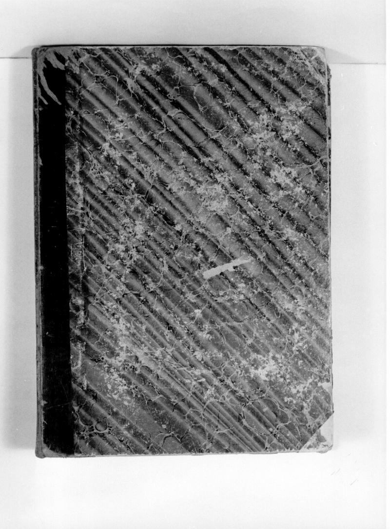Legatura: data :XIX; coperta: rigida, non piena; materia: piatti in cartone rivestito in carta tinta effetto marmorizzato (marrone, rosso, verde; dorso e angoli ricoperti in pelle; contropiatti in carta bianca.
