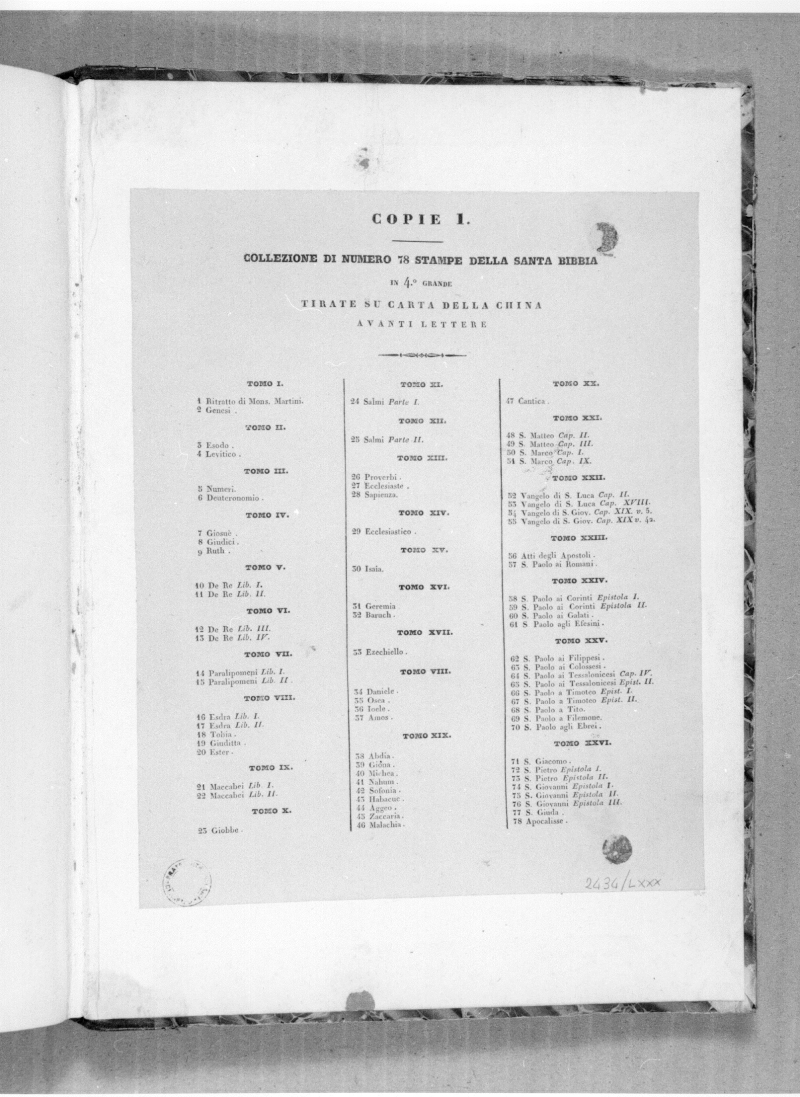 79 stampe filigranate incise all’acquaforte e bulino, ritagliate entro i margini, di varie misure (Foglio:200x125; 222x150) ed interamente incollate sulla pagina, con scene dell’Antico e Nuovo Testamento; nel contropiatto inferiore è incollato l’indice stampato delle tavole. Le pagine risultano improntate.