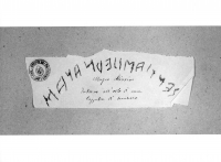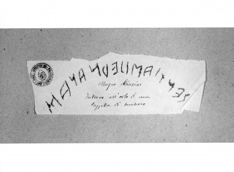 - Iscrizioni: in alto al centro inscrizione etrusca su una riga e al centro, manoscritta a penna e inchiostro:"Museo Chiusino/intorno all'orlo di una/tappera di bucchero".