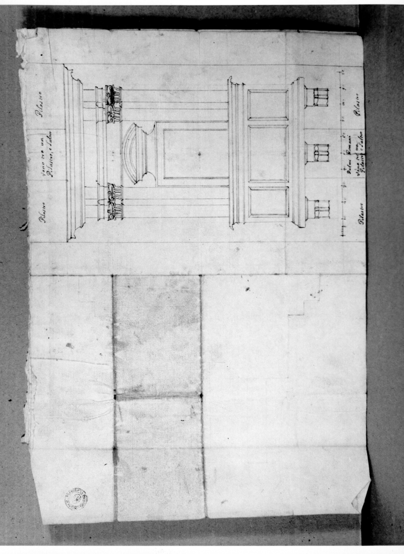 - Iscrizioni:in basso,da destra a sinistra, manoscritta e penna e inchiostro:"Pilastro-Palmi Romani/Vano tra un Pilastro e l'altro-Pilastro"; in alto da destra a sinistra,manoscritta a penna e inchiostro:"Pilastro-Palmi Romani/Vano tra un Pilastro e l'altro-Pilastro"; nel verso a sinistra, manoscritta a matita nera, all'interno di un cerchio:"10". Il foglio è stato incollato ad altri due fogli (inv.n. 1823,inv. n.1822)attraverso una porzione di carta bianca incollata nel margine superiore.