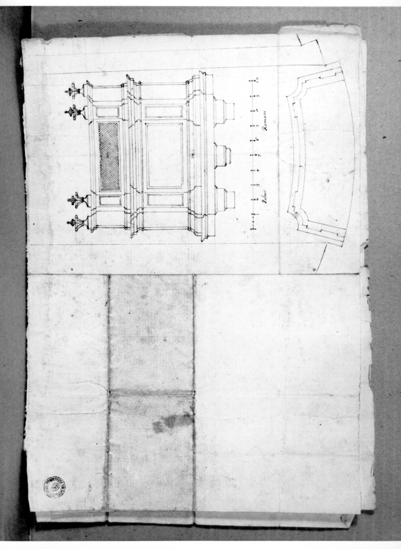 - Iscrizioni:in basso al centro, manoscritta a penna e inchiostro:"Palmi Romani". Il foglio è stato incollato ad altri due fogli (inv.n. 1824,inv. n.1822)attraverso una porzione di carta bianca incollata nel margine superiore. Questo foglio, insieme agli inv. nn. 1822 e 1824 fanno parte di un gruppo di studi per una balconata o ballatoio. I fogli sono stati evidentemente piagati e spediti forse in forma di missiva (non è presente alcun indirizzo di destinatario, o mittente).