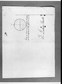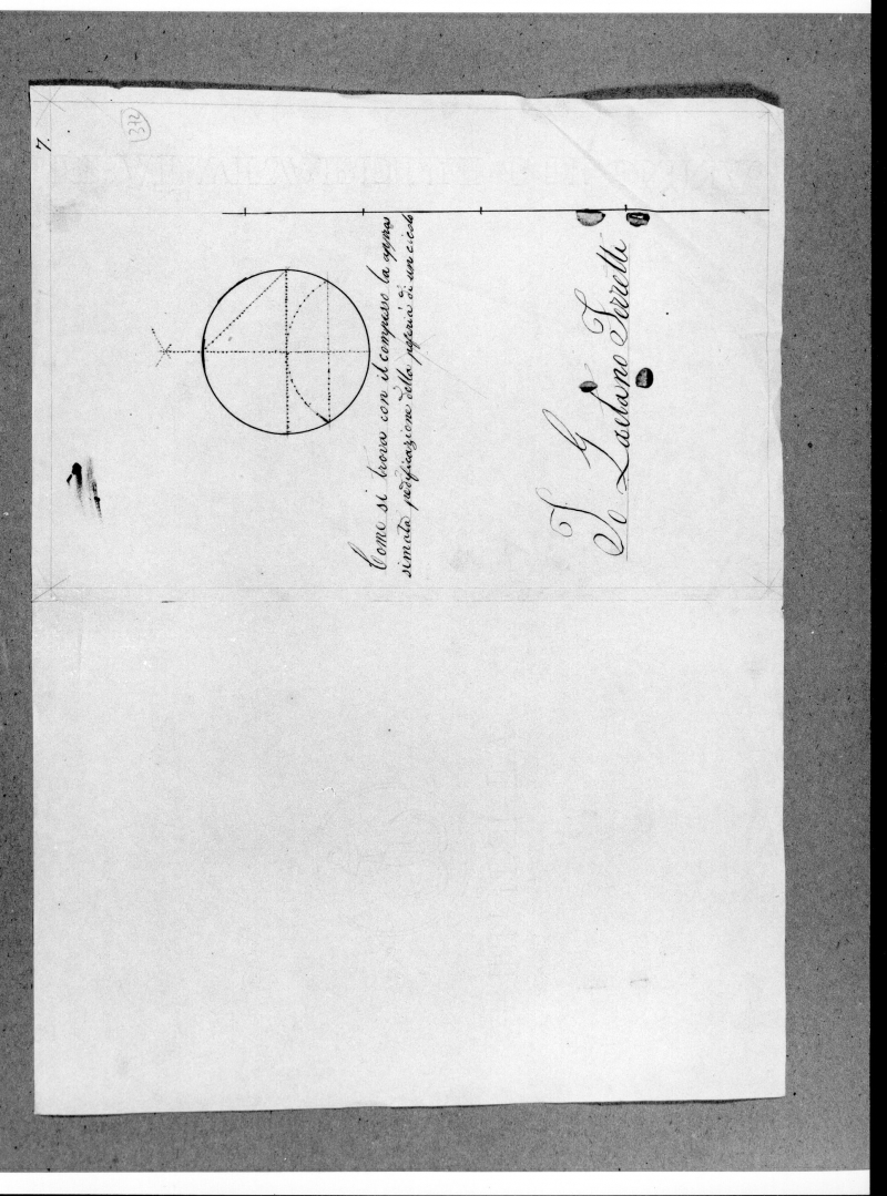 - Iscrizioni: sul recto, in alto al centro, manoscritta a penna e inchiostro :"7"; nel recto sul margine laterale destro, manoscritta a matita nera all'interno di un cerchio :"323"; nel recto, all'interno della figurazione in basso a sinistra, manoscritta a penna e inchiostro:" Io Gaetano Ferretti "; nel recto, al centro manoscritta a penna e inchiostro:"Come si trova con il compasso la appros/ simata pedificazione della poferia di un cicolo". Il disegno è stato realizzato dall'allievo Gaetano Ferretti dell' Accademia di Disegno verso il 1851.