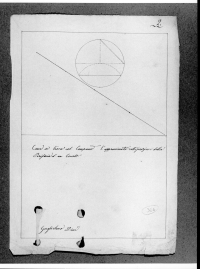 - Iscrizioni: nel recto sul margine laterale destro, manoscritta a matita nera all'interno di un cerchio :"366"; nel recto in alto a destra, manoscritta a penna e inchiostro:"2"; nel recto all'interno della figurazione, manoscritta a penna e inchiostro:"Come si trova col compasso l'approssimata rettificazione della/ Periferia di un Circolo"; nel recto, in basso a sinistra manoscritta a penna e inchiostro:"Guglielmo Dini".