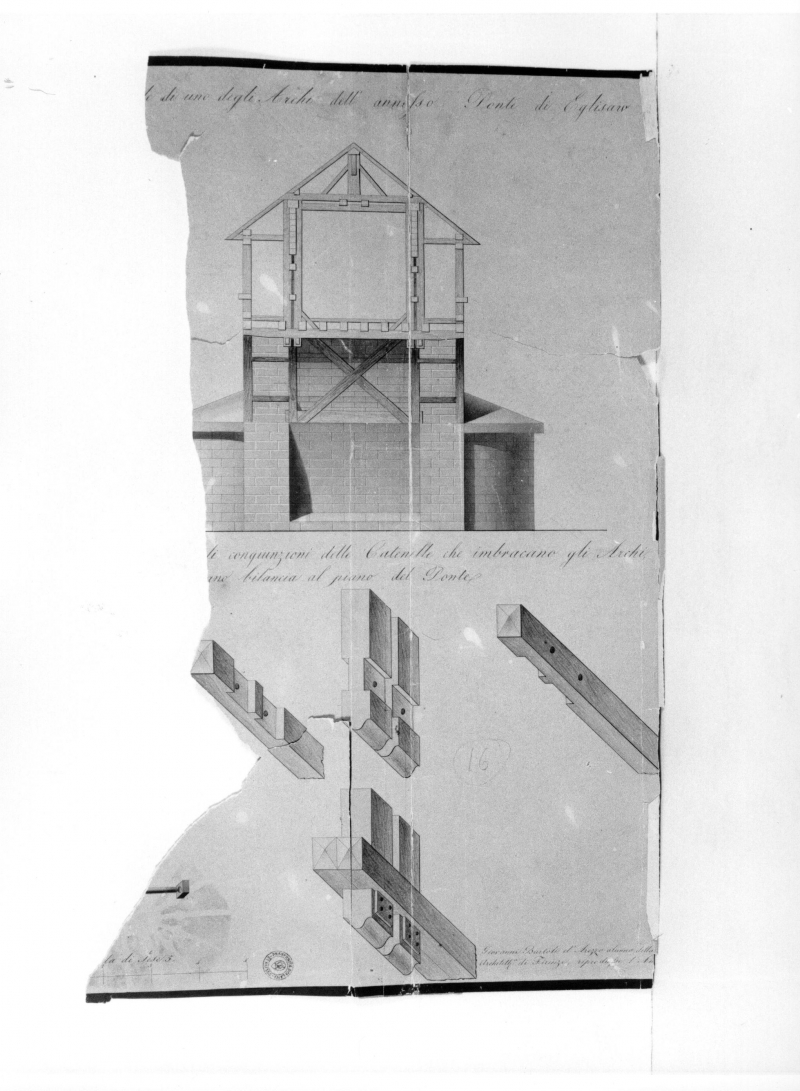 Iscrizioni: In alto:" [...] di uno degli Archi dell' annesso ponte di Eglisano [...]"; al centro:"[...] congiunzioni delle Catenelle che imbracano gli Archi, [...] / bilancia al piano del Ponte";in basso cerchiato :"16"; in basso a destra:" Giovanni Bartoli d'Arezzo alunno della [...] / Architet. a Firenze, riprodusse 1°[...]". - Timbri