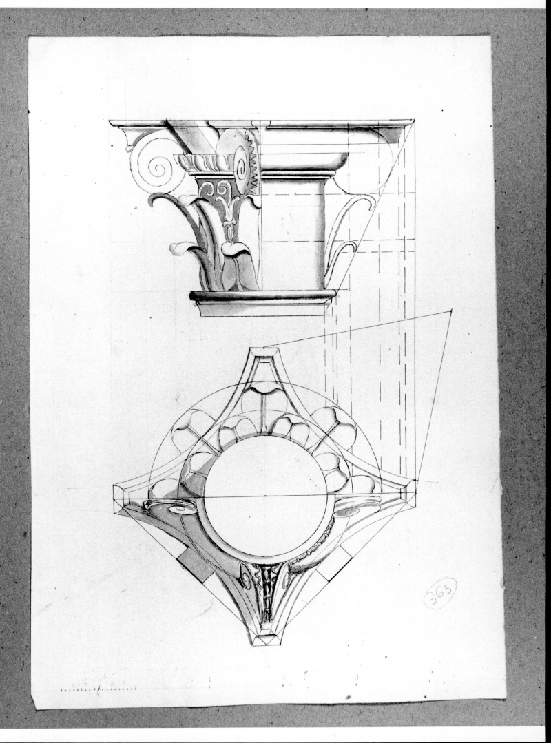 - Iscrizioni: nel recto sul margine inferiore è presente una scala numerica a matita nera, nel recto in basso a destra, manoscritta aal'interno di un cerchio"363"; Il disegno è stato realizzato da un'allievo dell' Accademia di Disegno verso il 1851.