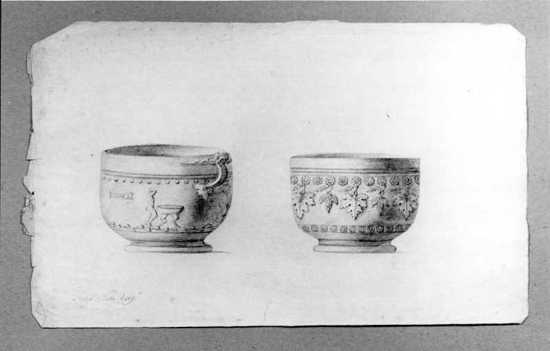 - Iscrizioni: in basso a sinistra, manoscritta amatita nera:"Luigi Nuti diseg:o"; all'interno della prima coppa da sinistra, manoscritta a matita nera: "PCOREL".