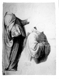 - Due studi di panneggio: una figura in piedi di profilo con libro e il busto di un frate .