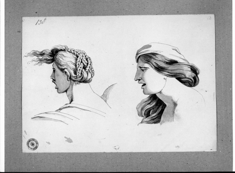 Due studi di testa femminile con capelli intrecciati e sciolti.