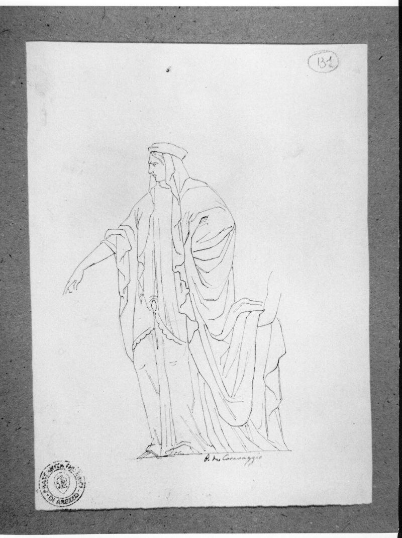 Figura maschile ammantata con braccio proteso, da Polidoro da Caravaggio.