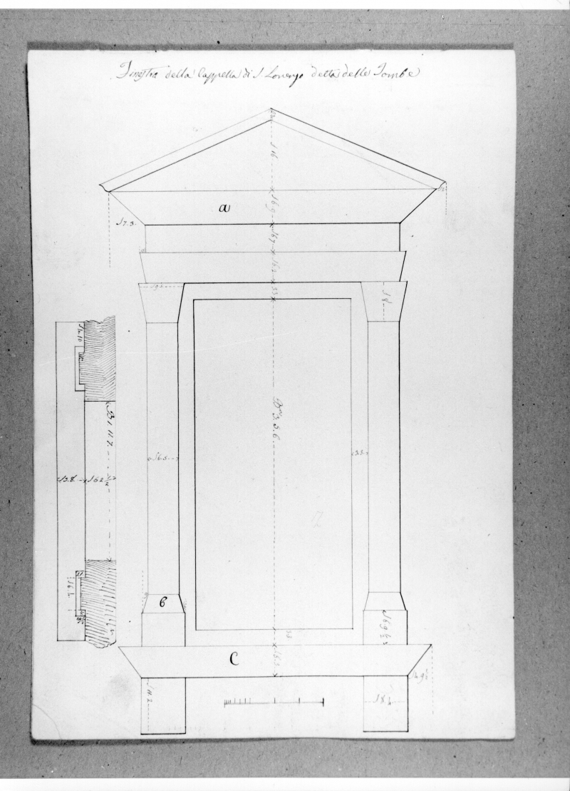 - Iscrizioni: in alto a l centro, manoscritta a penna e inchiostro:"Finestra della Cappella di S. Lorenzo detta delle Tombe".