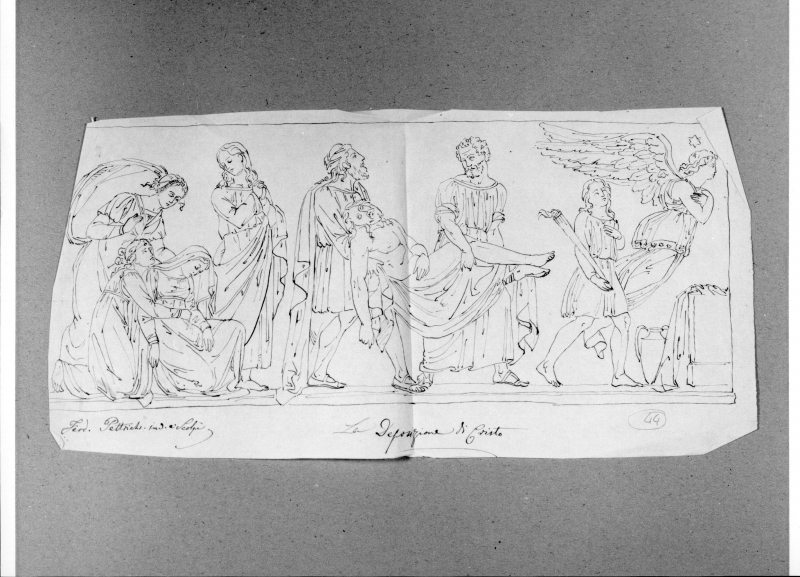 - Iscrizioni: in basso al centro, manoscritta a penna e inchiostro:"La Deposizioone di Cristo"; in basso a sinistra, manoscritta a penna e inchiostro:"Ferd. Pettrich. inv. e Scolpì"; in basso a destra, manoscritta a lapis, all'interno di un cerchio:"44".