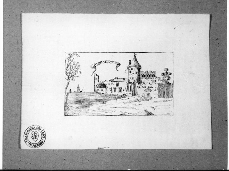 - Iscrizioni: all'interno della figurazione, nel cartiglio al centro:" ARCHANBAV"; nel verso, in basso a destra, manoscritta a matita nera:"8.I".