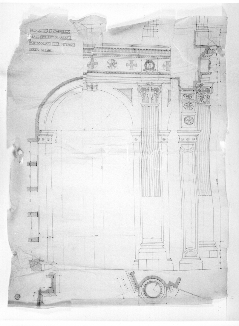 - Iscrizioni: In alto a sinistra, manoscritto a pennino a china: " PROGETO DI CAPPELLA/PER IL CIMITERO DI AREZZO/PARTICOLARI DELL'INTERNO/SCALA DA . 1. A 10"; in alto al centro, manoscritta a pennino a china: " linea d'imposta della cupola".