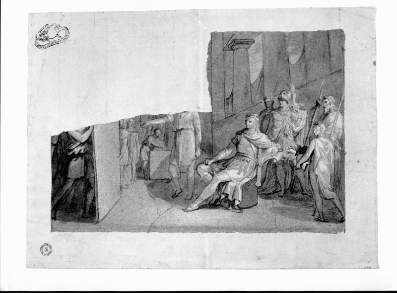 Scena con condottiero seduto in interno e soldati.