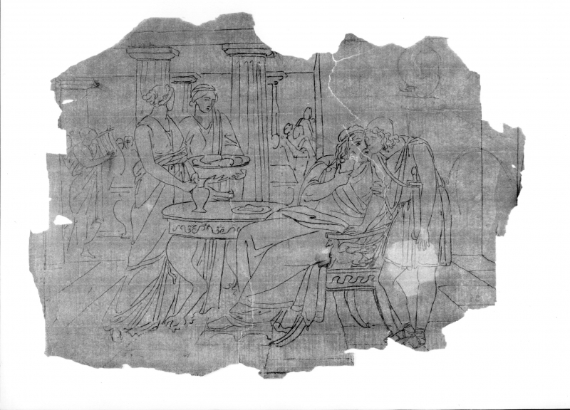- Scena di ambientazione antica con figure e un uomo seduto che parla all'orecchio di un giovane