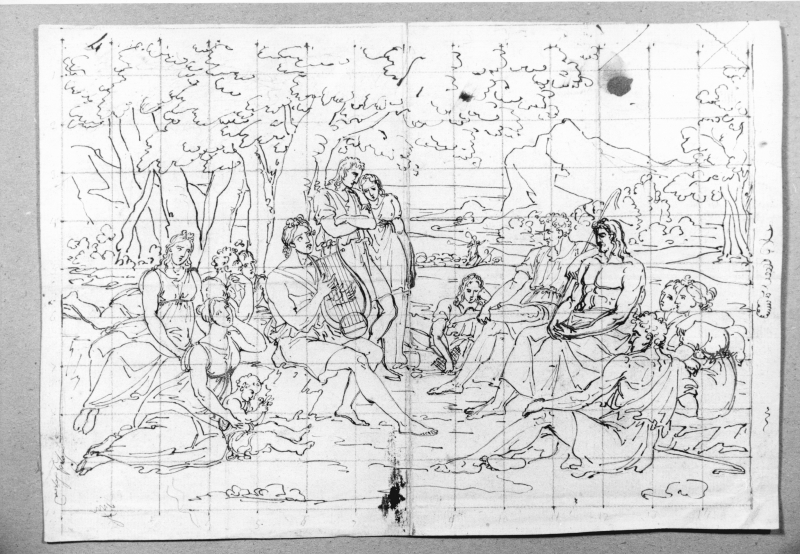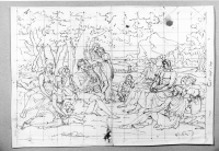 Le incisioni seguono e vanno sopra ai tratti a matita nera sottostante e anche quelli a penna e inchiostro, anche se non in maniera sistematica e continua. Il disegno pare dunque essere stato ricalcato, forse successivamente e non dallo stesso autore su altro foglio. L'annerimento del verso pare confermare questa ipotesi. Inoltre la presenza della quadrettatura implica che il disegno sia stato anche trasferito e ingrandito per essere posto su altro foglio.