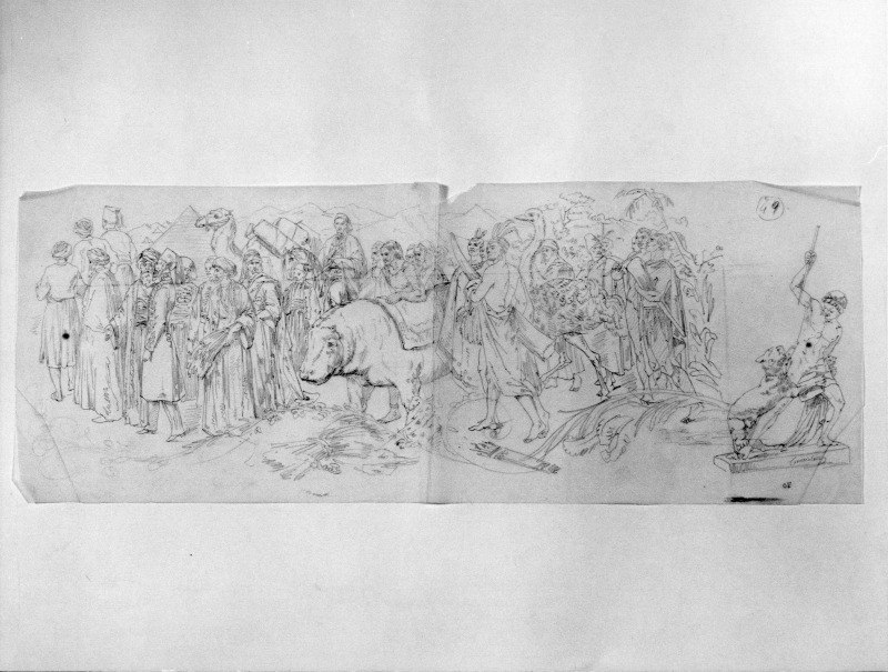 - Scena orientalista con corteo, piramidi, e animali e studio da scultura con cacciatore a sinistra.