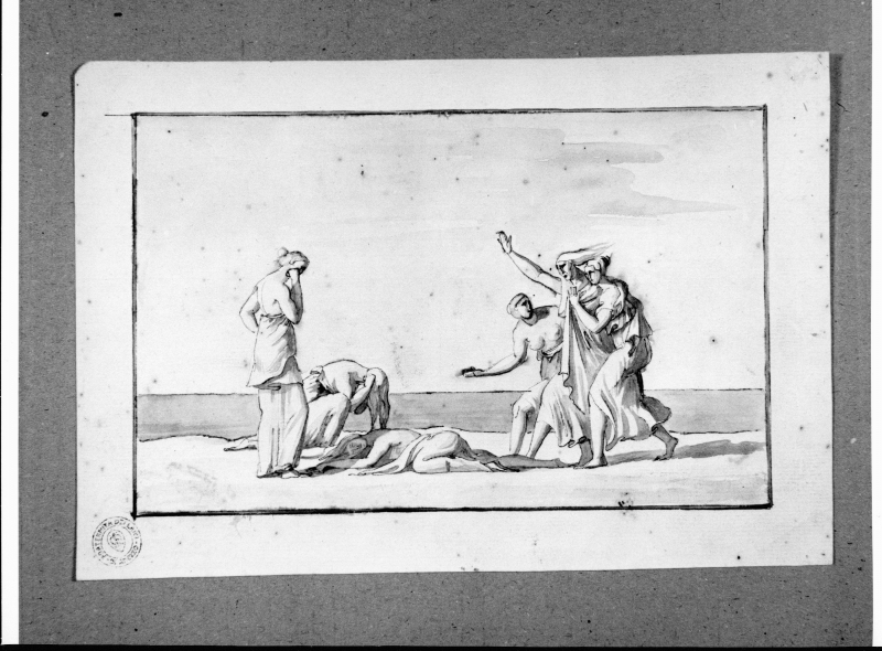 Scena tragica con sei figure femminili, di cui una a terra (recto).
