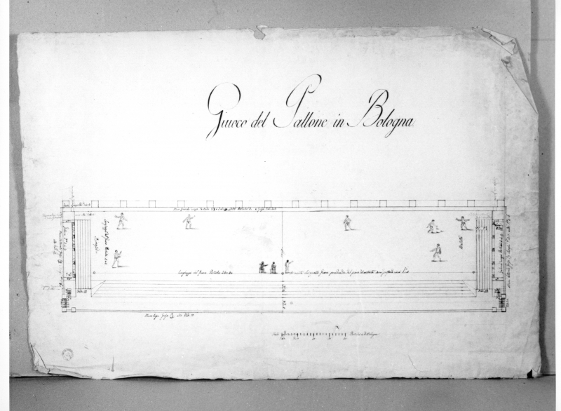 - Iscrizioni: in alto al centro, manoscritta a penna e inchiostro:"Il Giuoco del pallone in Bologna".