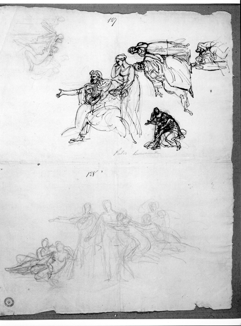 - Iscrizioni: in alto al centro, manoscritta a penna e inchiostro:"127"; al centro, appena sotto la prima composizione, manoscritta a matita nera: "Pietro Benvenuti"; al centro, manoscritta a penna e inchiostro:"128"; nel verso, nell'angolo inferiore destro, manoscritta a matita all'interno di un cerchio:"18".