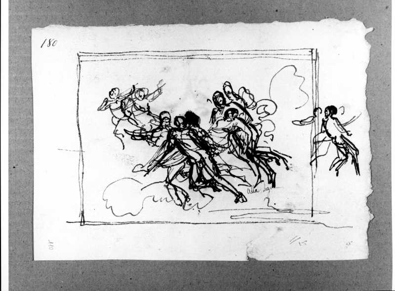 - RECTO: Schizzo di scena con putti e figure allegoriche che trasportano un corpo. VERSO: due schizzi di figure volanti.
