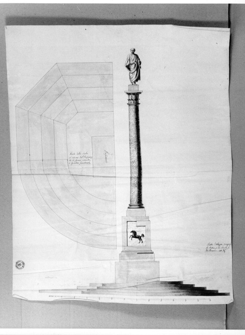 - Iscrizioni: Sul lato sinistro al centro, manoscritta a penna e inchiostro: "Pianta della Scala/all'intorno del basamen/ to di forma rotonda/ e grande scantinata"; in basso a destra:"Fatta all'altezza compresa/ la statua, e la scala , a / di braccia 20.3/4".