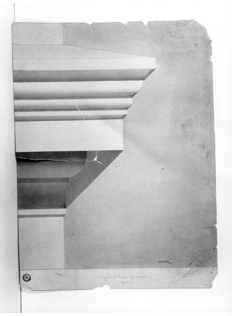 - Iscrizioni: nel margine inferiore al centro, manoscritta con penna e inchiostro: "Terzo lavoro di Sciografia sulle modanature/architettoniche"; in basso a sinistra, manoscritta con penna e inchiostro: "Marzo 1899"; in basso all'estrema destra, manoscritta con penna e inchiostro: "Paolina Salvini"; in basso a destra, manoscritta con penna e inchiostro: "Visto E. Prof. Biscardi"; in basso a destra, manoscritta a matita nera, all'interno di un cerchio: "5".