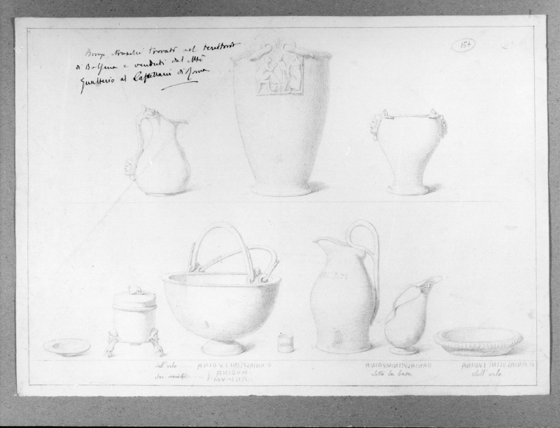 - Iscrizioni: In alto a sinistra, manoscritta a penna e inchiostro: "Bronzi etruschi trovati nel territorio/di Bolsena e venduti dal M.o/Gualtiero al Castellani di Roma"; In alto a destra, manoscritta a grafite :"157" cerchiato; in basso, partendo da sinistra sono le trascrizione delle parole etrusche rinvenutesugli oggetti : "sull'orlo (…)/sui manici (…); sotto la base (…); Sull'orlo (…)"; sul verso, manoscritta a lapis: "42".