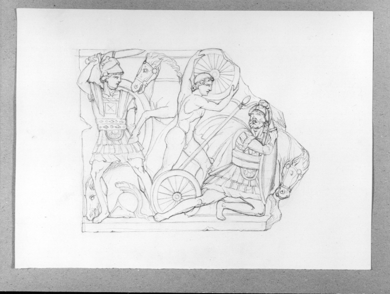 - Studio di frammento a rilievo con scena classica di combattimento con tre figure e tre cavalli.