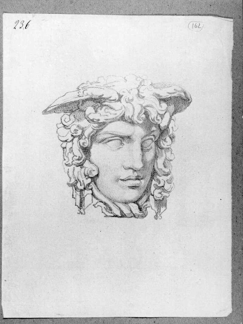 - Iscrizioni: in alto a sinistra, manoscritta a penna e inchiostro: "236"; in alto a sinistra, manoscritta a matita nera all'interno di un cerchio:"162". L'opera rappresenta la Medusa Rondanini.