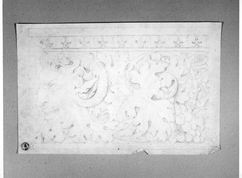 - Studio di ornato architettonico con foglie d'acanto e testa con corna.