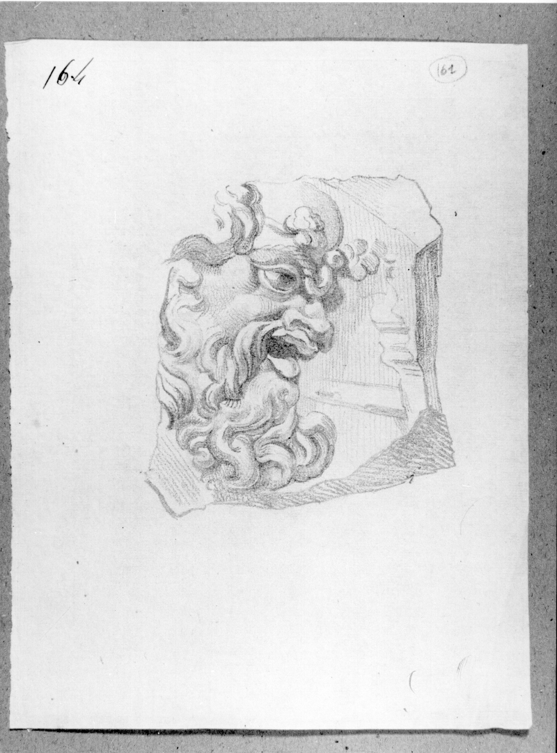Studio di rilevo antico con frammento di testa virile barbuta a bocca aperta.