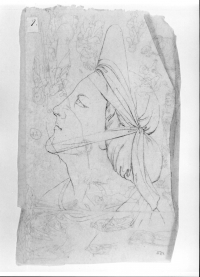 Studio di testa di dama medievale con copricapo da dipinto sec. XIV e altri schizzi.