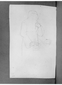 - Recto: Uomo anziano barbuto con cappuccio, tra le mani un bastone.
