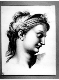 Testa femminile con capigliatura intrecciata di profilo (da Raffello?).