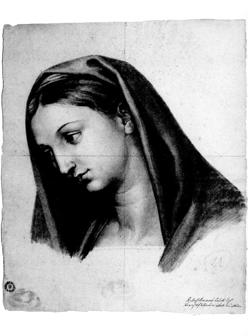 - Iscrizioni: in basso a destra, manoscritta a matita nera, all'interno di un cerchio"21";in basso a destra, manoscritta a penna e inchiostro:"Il Maestro Raimondo Zaballi dis.a/ La moglie Cherbina Zaballi donò 1863"; nel verso, in basso a destra:18.S.B.".