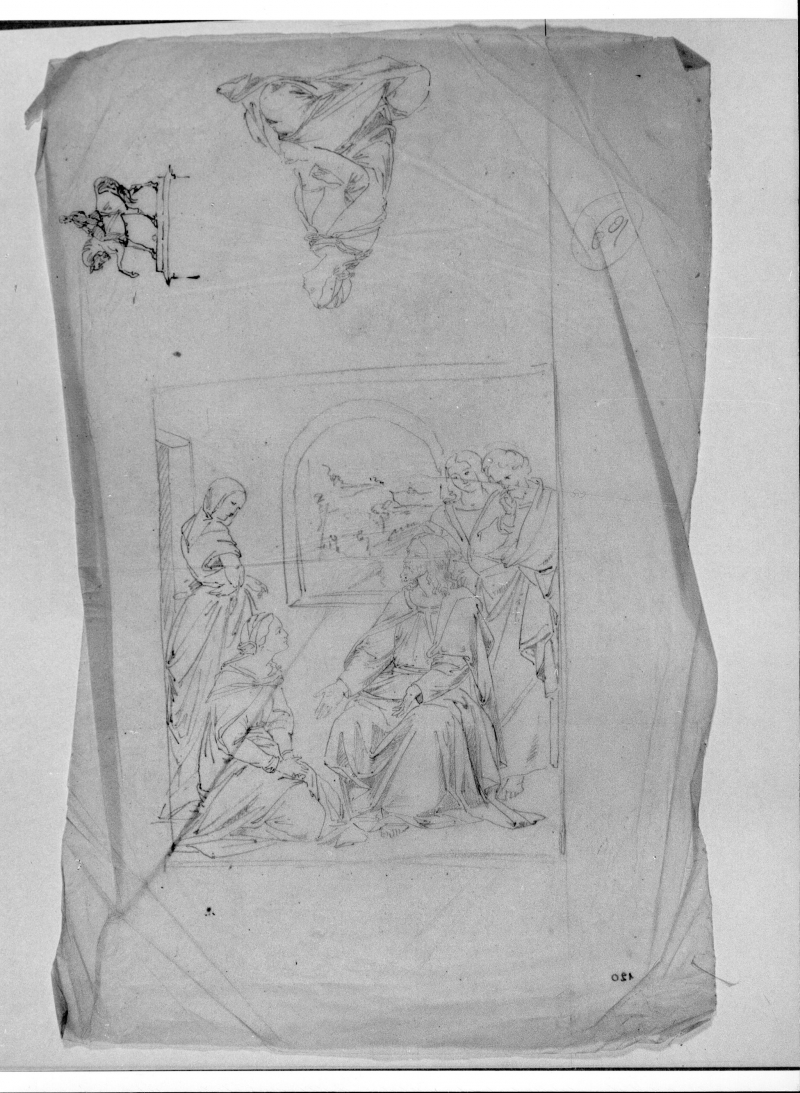- Schizzo per una composizione completa inquadrata da una linea di cornice con Cristo in casa di Marta e Maria; studio separato della stessa figura femminile (Maria)inginocchiata in alto al centro (rovesciata); studio a penna di Monumento equestre.