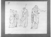 Tre studi di figure: figura singola e in coppia e al centro uomo con lancia di spalle.