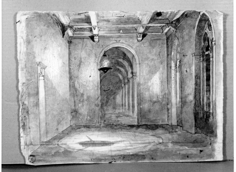 Veduta di un interno architettonico (scenografia teatrale) con due finestre, un portale e l'apertura verso un chiostro