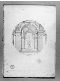 Tav. I: stampa incisa all’acquaforte (Lastra: 267x207ca.) da E. Dotti a Bologna, raffigurante la Veduta dell’interno della Tribuna di Galileo, progettata da G. Micheli.