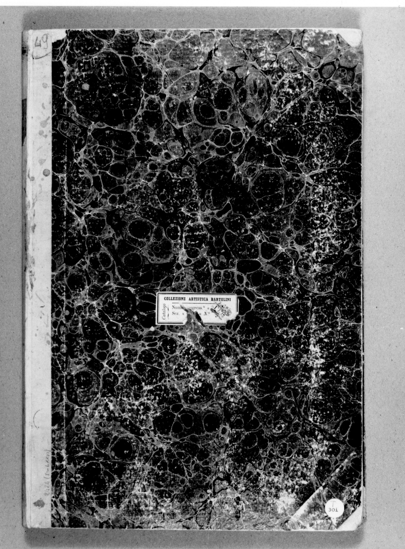 CARTELLINI: nel piatto superiore al centro è stato incollato il cartellino stampato "COLLEZIONE ARTISTICA BARTOLINI/catalogo/Num. […]gress. […]/Sez. […] N.[…]"; Nel piatto superiore in basso a destra, è stato incollato un cartellino circolare stampato "30i" ,al di sopra manoscritta a lapis "T".