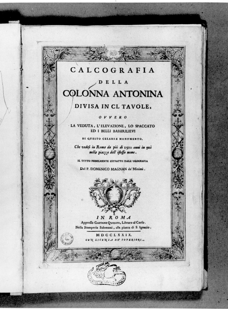 CONTIENE: Esemplare completo de “Calcografia della Colonna Antonina divisa in CL tavole, ovvero, la veduta, l’elevazione, lo spaccato ed i belli bassirilievi di questo celebre monumento, che vede in Roma da piu’ di 1500 anni in qua nella piazza dell’istesso nome. Il tutto fedelmente estratto dall’olografia del P. Domenico Magnan de’ Minimi", In Roma, appresso Gaetano Quojani, Libraio al Corso. Nella Stamperia Salomoni, alla piazza di S.Ignazio. MDCCLXXIX. Con licenza de’ superiori." : 150 incisioni ad acquaforte (Lastra:145x167) due per pagina su carta filigranata; frontespizio inciso all'acquaforte (Lastra:330x216); 1 tavola recto/ verso dov’è , illustranti scene dalla colonna Antonina.stampato l’indice dei rami contenuti nell’opera , introdotto da una breve descrizione della colonna.